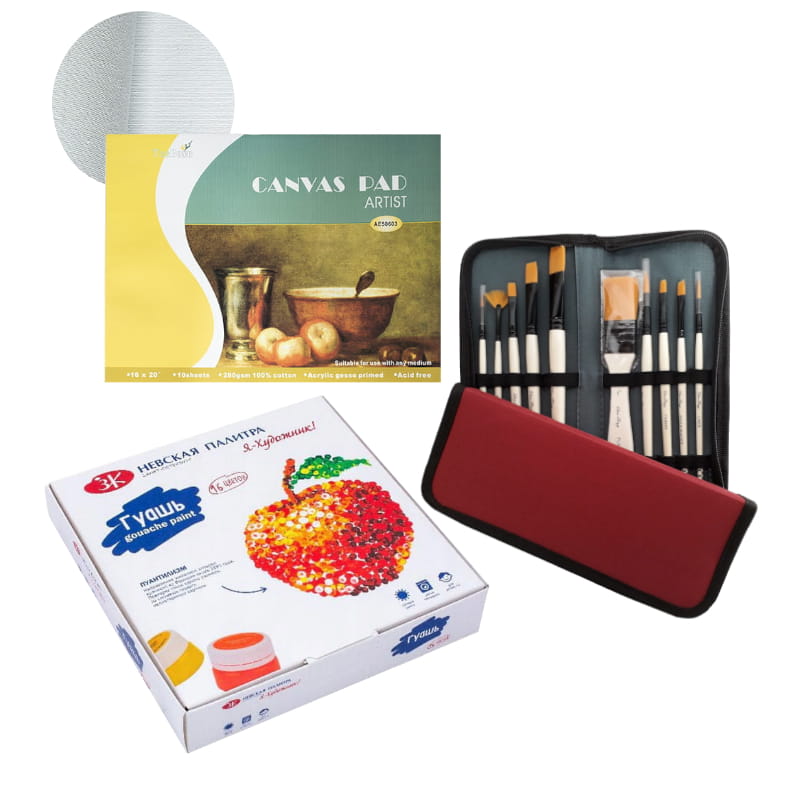 Zestaw artystyczny - gwasze, blok z płótnem, pędzle